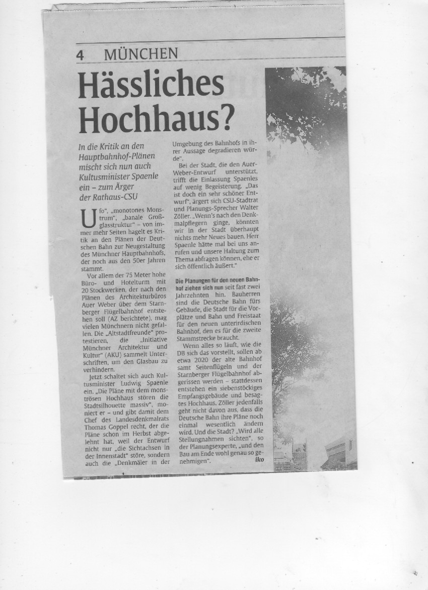 Altstadtfreunde München "Neuer Hauptbahnhof : stört erheblich" erschienen in der AZ vom 22.02.2016